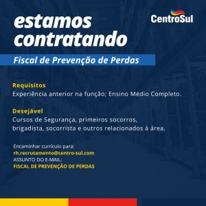 Encaminhe o seu currículo atualizado para rh.recrutamento@centro-sul.com com o cargo ou área de interesse no assunto.